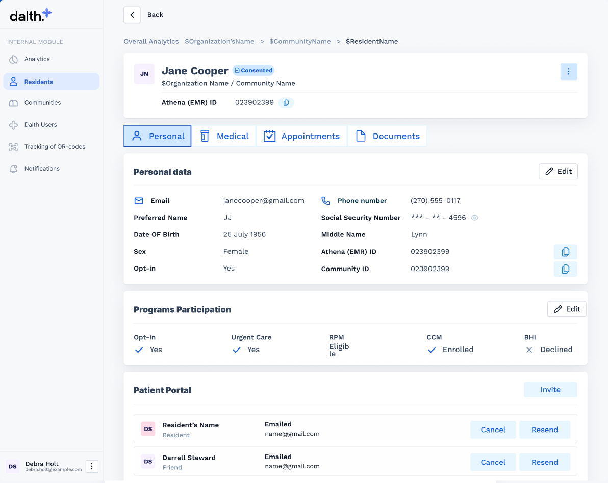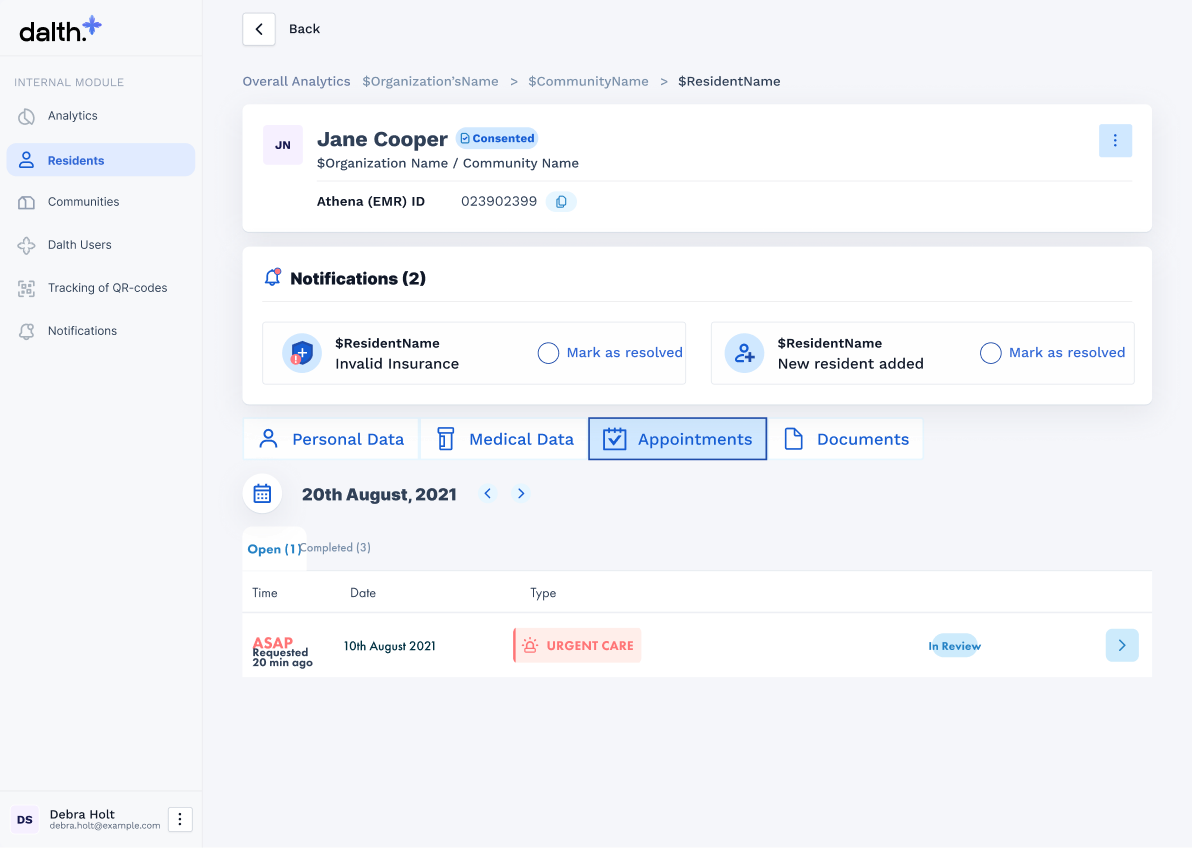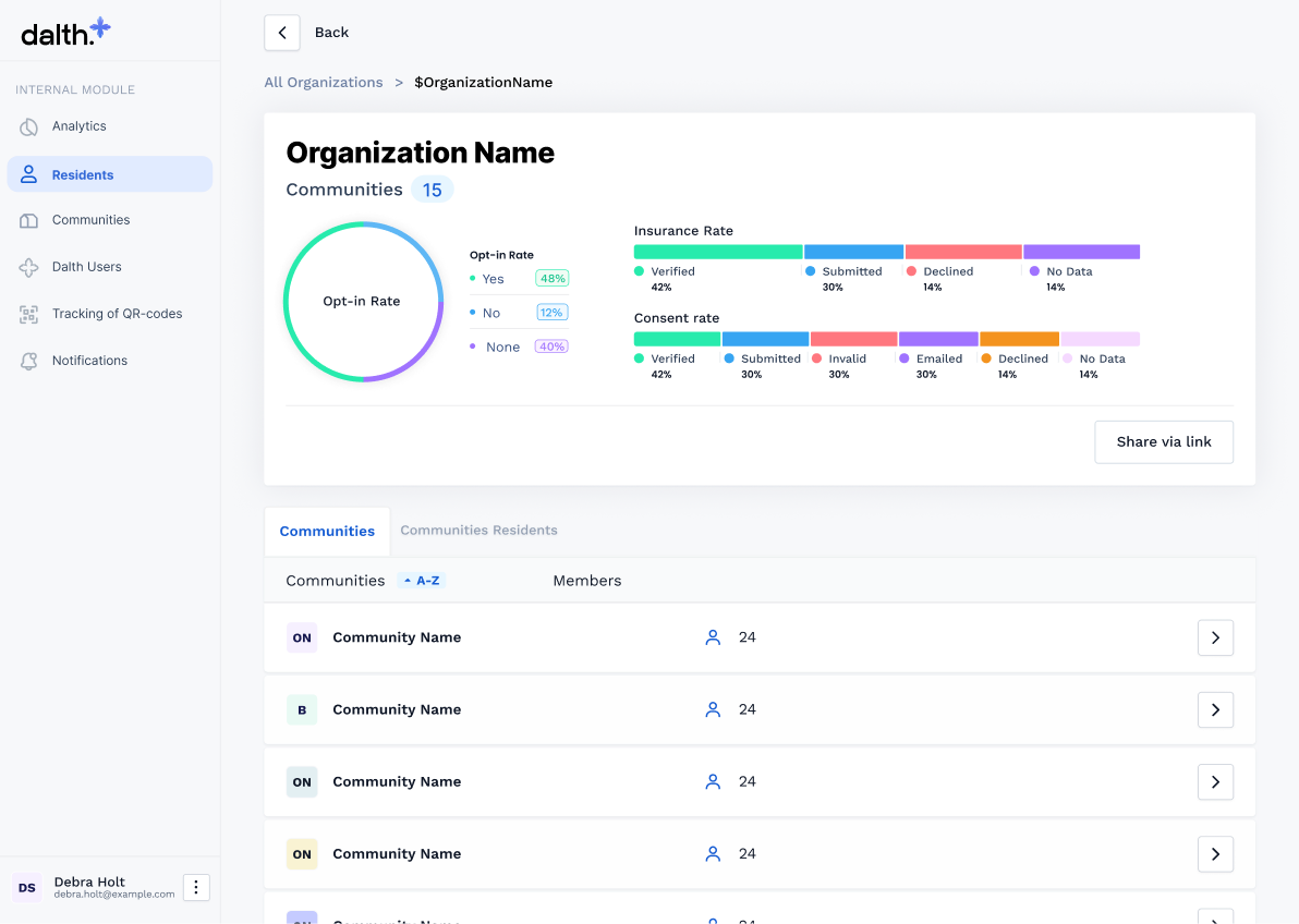 | 2 | Community admins & Dalth staff | Internal & external modules, Admin panel | Community-level access, CRUD communities, analytics, manage residents & members, consent & insurance review, notifications, QR scanning |